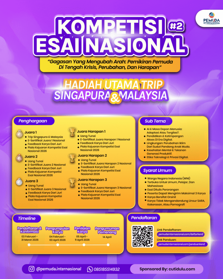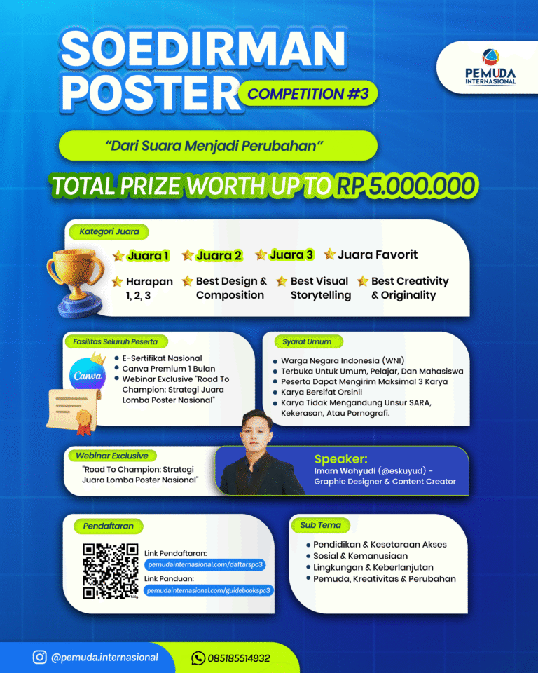 Explore, Learn, and Connect with Pemuda Internasional A global platform empowering youth to discover opportunities, gain knowledge, and build meaningful networks across cultures. 100+ Alumni 10.000+ Peserta Pendaftar Alumni Berasal Dari Program Yang Sedang Berjalan Pilih program yang akan bantu kamu berkembang Soedirman Poster Competition #3 Daftar Soedirman Poster Competition #3 Panduan Soedirman Poster Competition #3 Kompetisi Esai Nasional #2 Daftar Kompetisi Esai Nasional #2 Panduan Kompetisi Esai Nasional #2