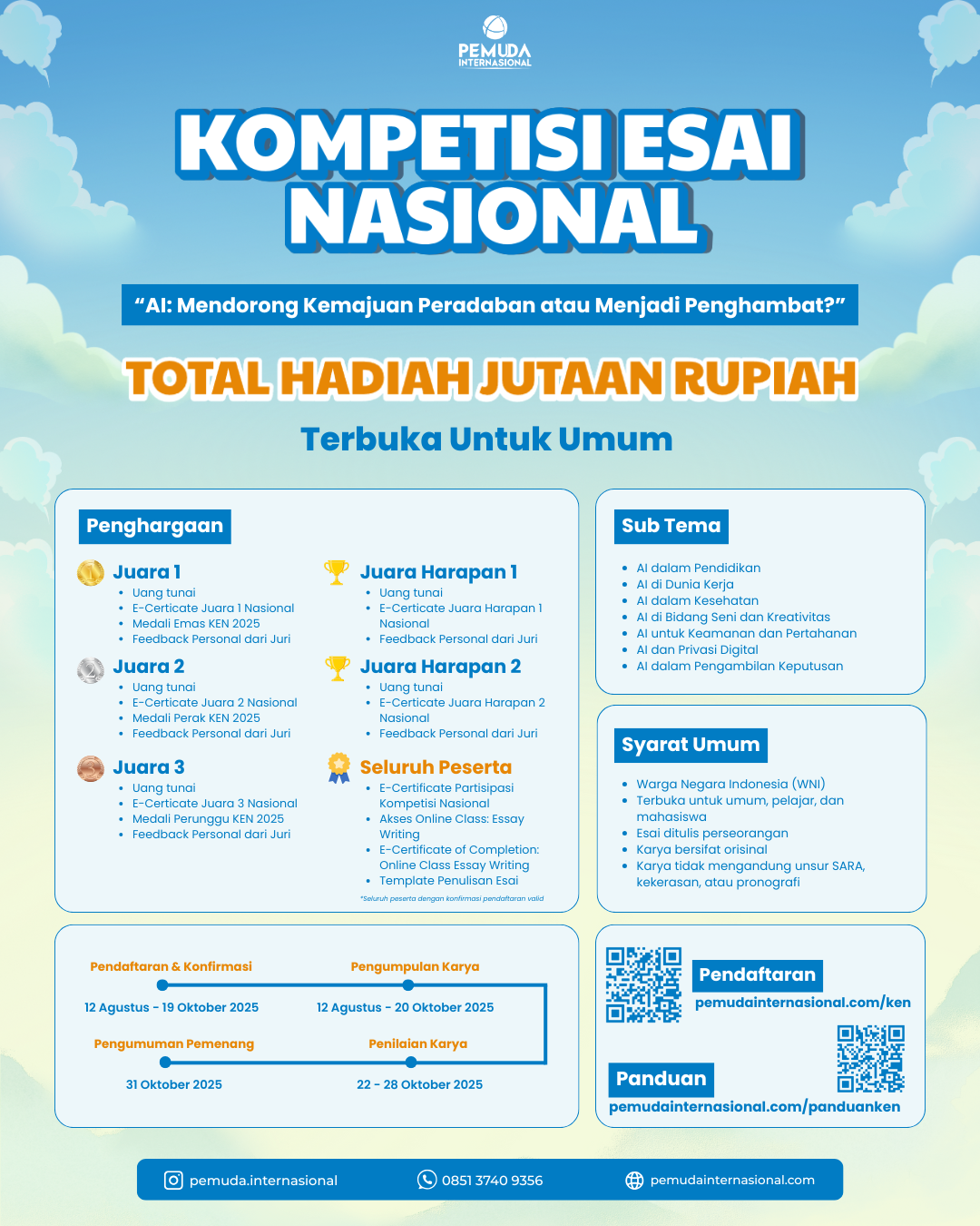 ๐ Juara 1: Uang tunai + E-Certificate Juara 1 Nasional + Medali Emas KEN 2025 + Feedback personal dari juri